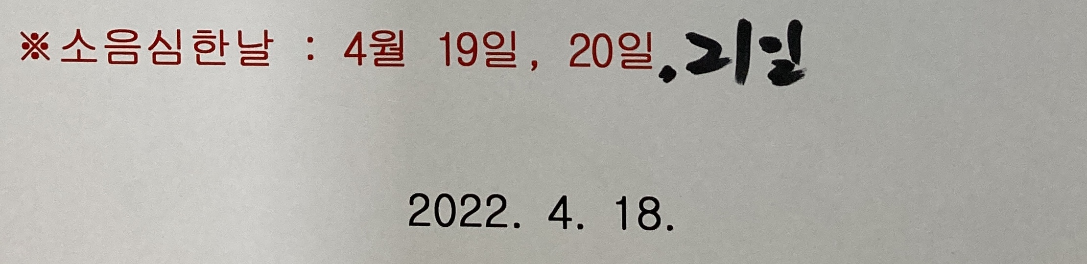 - 아랫집 인테리어 공사가 아직 끝나지 않았나 보다. 그 소음에 소스라치게 놀라며 강제로 기상해서 하루를 시작했다. 어제도 소음 때문에 카페로 나가면서 분명히 봤던 공사 안내문에 소음 심한 날은 어제가 마지막이라고 적혀 있었으니, 오늘은 이러다 말겠지 생각했다. 그런데 10시가 넘어서 스크럼이 시작됐는데도 소음은 잦아들 줄을 몰랐다. 스크럼도 제대로 못하고 이렇게 된 거 안내문에 나와 있는 업체에 전화라도 해볼까 해서 나가봤더니 그새 오늘 날짜를 펜으로 적어놨다.